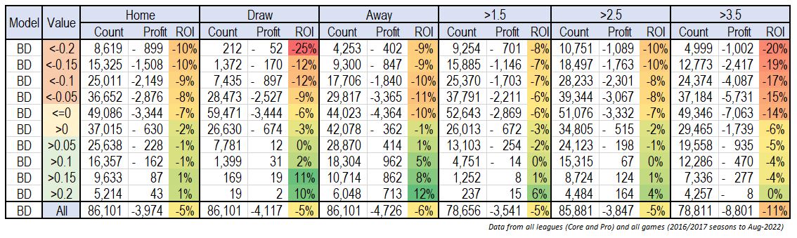 Below is the output across all leagues (Core and Pro) for the Blend model. It is broken down by the various value bands in 5% increments e.g. >0.1 shows all games where the model was showing 10% value (reminder: Value Calculation = Poisson Model Output (minus) 1/Opening Odds).